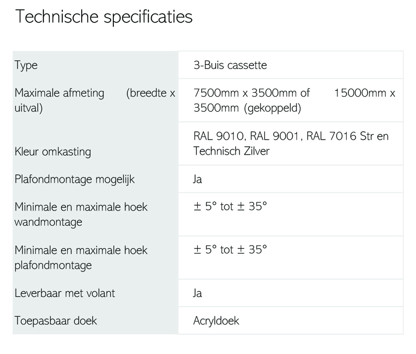 Het Senza terrasscherm is zeer geschikt voor toepassing in de horeca of voor zeer brede gevels. Met een breedte van 7500 mm is dit het breedste terrasscherm uit ons assortiment. De Senza is koppelbaar tot 15000 mm breed.