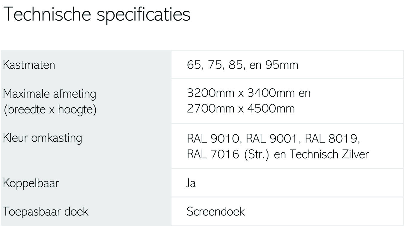 Deze vlak hangende verticale zonwering is geschikt voor vrijwel iedere situatie en heeft een zeer gunstige prijsstelling. De Excellent screen is dan ook zeer populair als buitenzonwering voor particulieren. Indien de screen zeer windbestendig moet zijn, raden wij u de Excellent screen windvast of de SolidScreen aan. De Solidscreen is bestand tegen windsnelheden tot 145 km/h (12 Beaufort).
